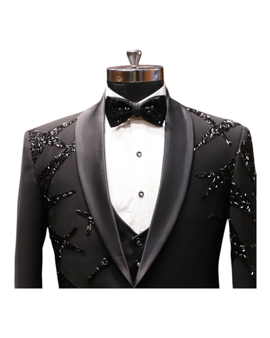 Black Hand Embroidered Tuxedo Suit, Zari Black Cutdana Work Tuxedo Suit, Hand Embroidered Designer 3Piece & Bow Tuxedo suit, wedding party suit, custom size