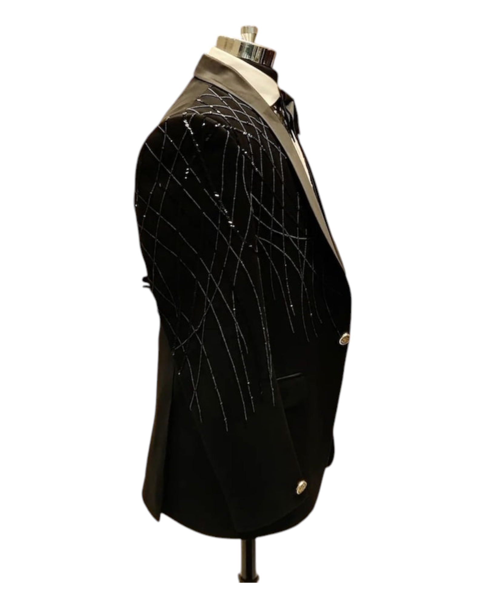 This elegant men's tuxedo suit features black embroidery that adds a touch of sophistication to any occasion. The perfect choice for weddings and formal events. Note : White Shirt Will Be Plain White Material : Suiting, Satin Lining Style : Slim Fit Italian Cut Slit Details : Double Slit Color : Black Button Types : Fancy Button, with Pocket Square Wash Type : Dry Clean Only Bottom Type : Trouser Bottom Fabric : Suiting Bottom Color : Same Color ◾ The Outfit is Fully Stitched