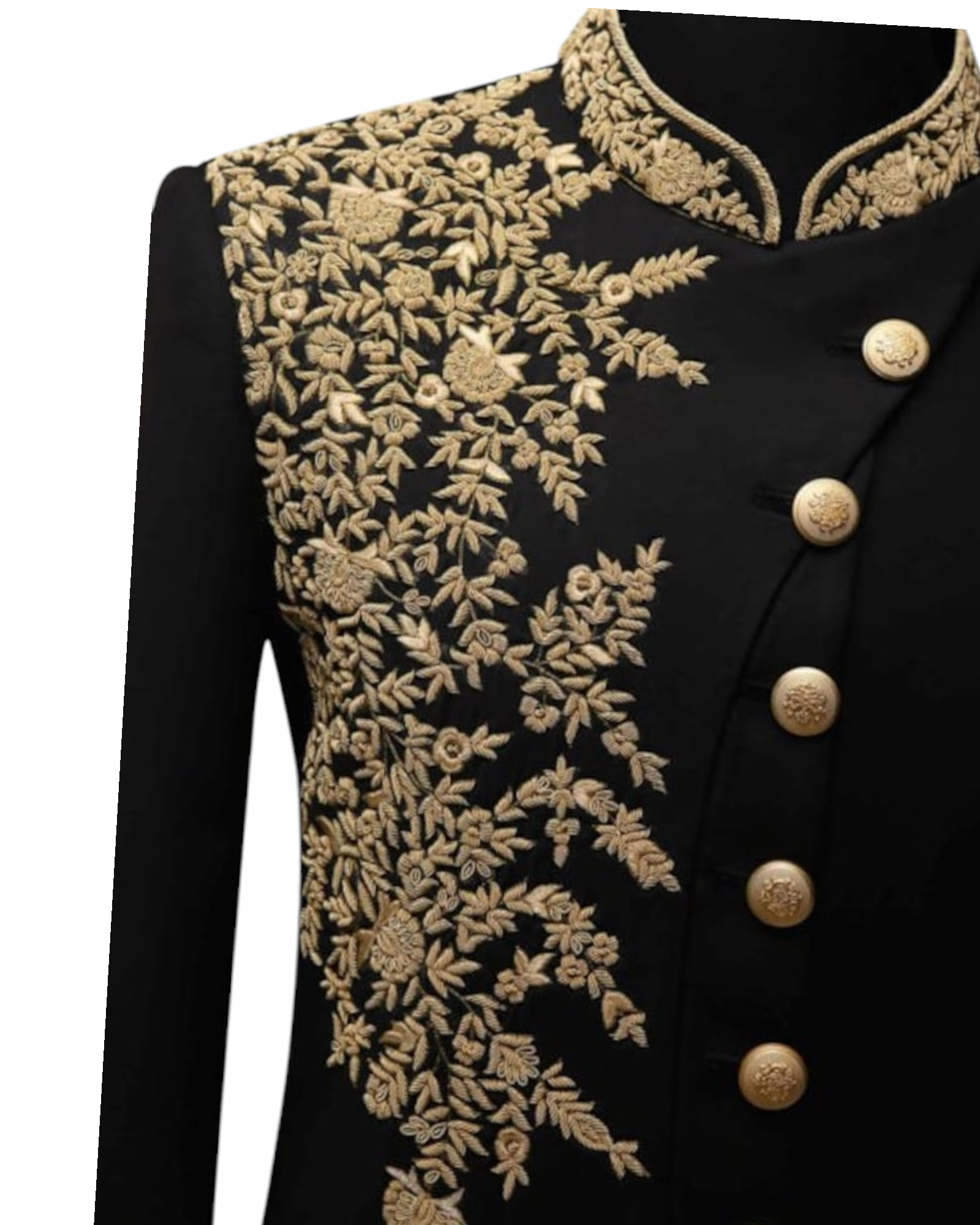 Men's Black Handcraft Indowestern Suit, Hand-Made Golden Embroidery Zari Work Sherwani