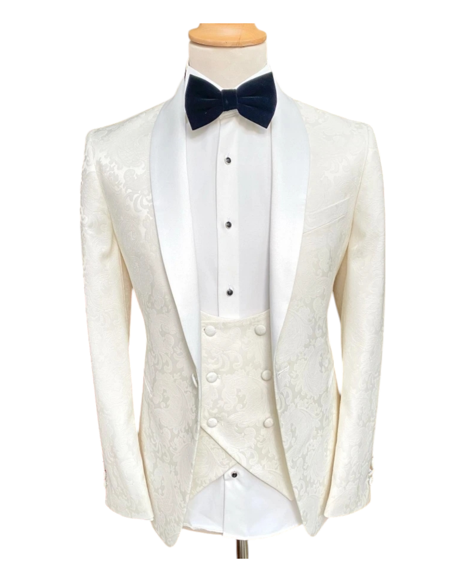 This White Three Pieces Jacquard Suit is meticulously designed for weddings and formal events. Featuring a shawl lapel and a single lapel white satin tuxedo jacket, it offers a refined blend of texture and sheen. The jacquard fabric adds subtle pattern depth, while the tailored three-piece construction ensures a sharp, polished appearance. Ideal for the modern groom or distinguished guest, this suit combines classic craftsmanship with contemporary style for a confident, elegant presentation.